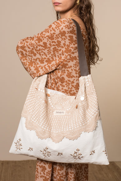 Μεγάλη τσάντα ώμου από παραδοσιακό εργόχειρο φτιαγμένο με το βελονάκι συνδυασμένο με κέντημα και χεράκι από οικολογικό δέρμα